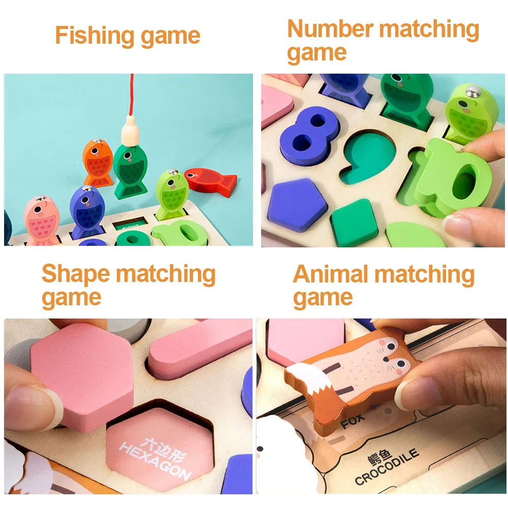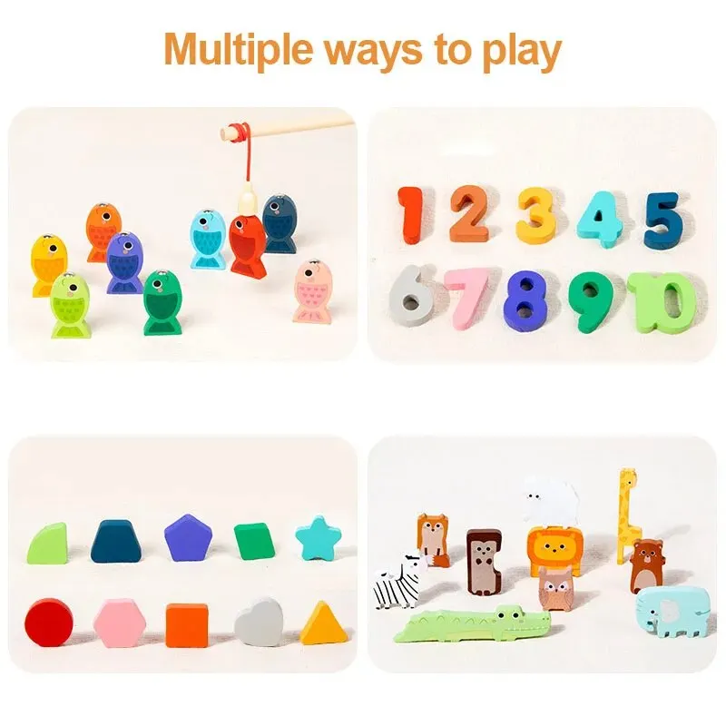 Contrairement à un jouet qui ne propose qu’une seule activité, ce jeu Montessori en bois 4 en 1 permet à l’enfant de varier les exercices sans se lasser. Il peut passer des chiffres aux formes, puis aux animaux, puis à la pêche, selon son envie.